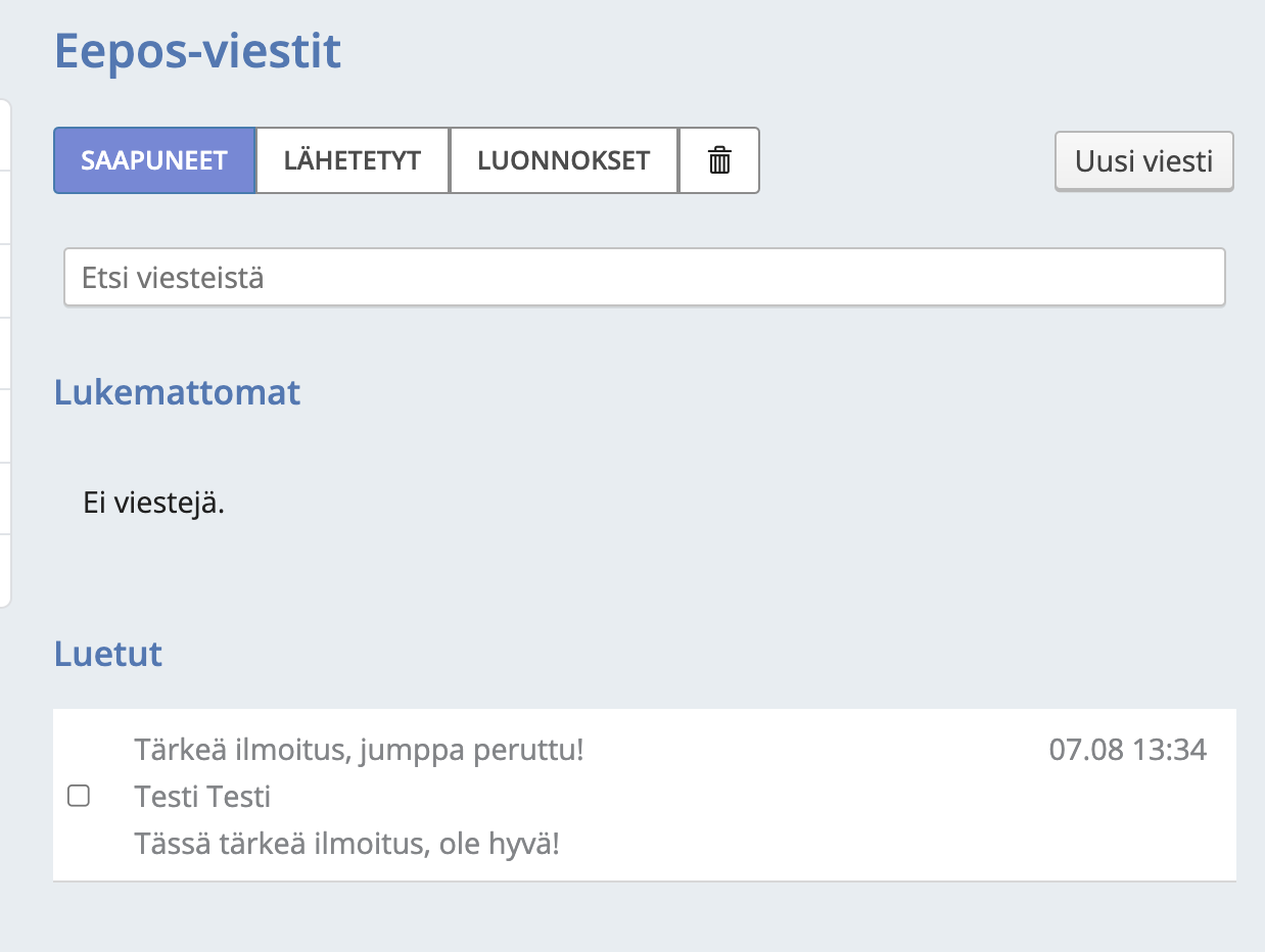 Eepos-viesteillä opettajat, oppilaat ja huoltajat voivat viestittää turvallisesti koulunkäyntiin liittyvistä asioista. Eepos-viestit -sivulla viestit on eroteltu saapuneisiin, lähetettyihin ja luonnoksiin tallennettuihin viesteihin. Viestejä voi myös poistaa siirtämällä ne roskakoriin.
